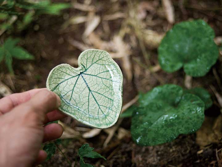 葉っぱのお皿作り、または「でんでんねこ」の絵付け体験。