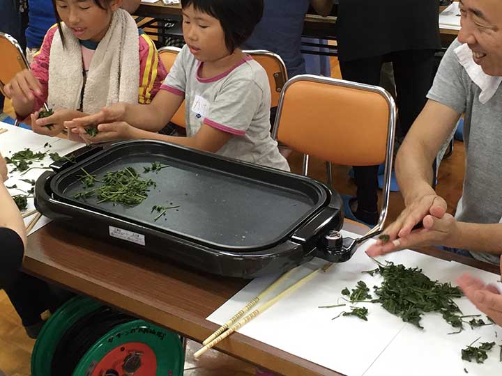 ホットプレートで煎茶を手作りします。最後に急須で淹れて、試飲します。